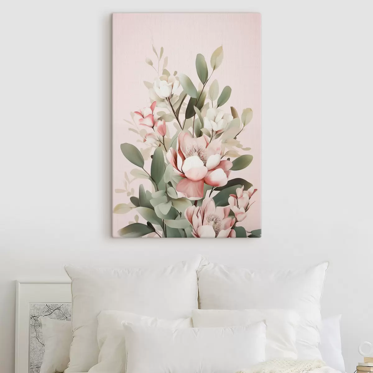 Tableau Un bouquet de fleurs aux couleurs pastel avec des feuilles d'eucalyptus, sur fond rose pâle s48727