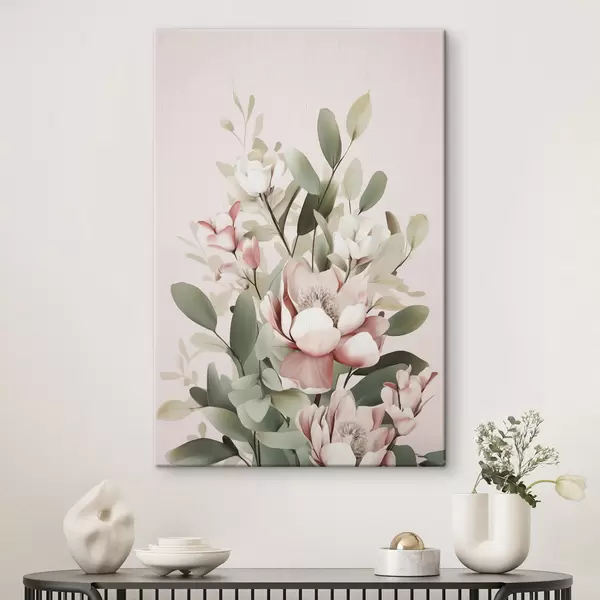 Tableau Un bouquet de fleurs aux couleurs pastel avec des feuilles d'eucalyptus, sur fond rose pâle Nr s48727