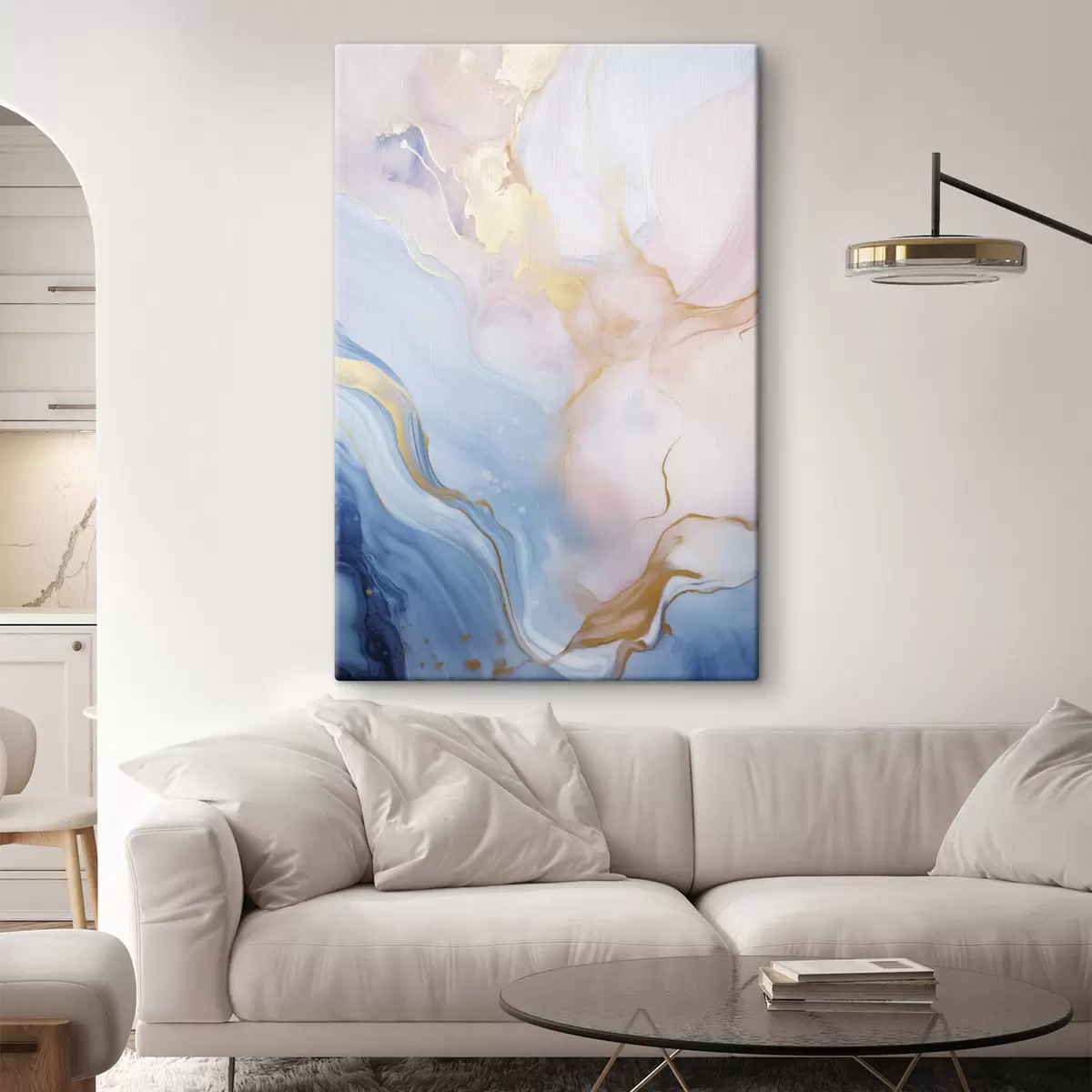 Tableau Œuvre d'art fluide abstraite aux textures variées, avec des motifs tourbillonnants dans des tons roses et bleus s48730