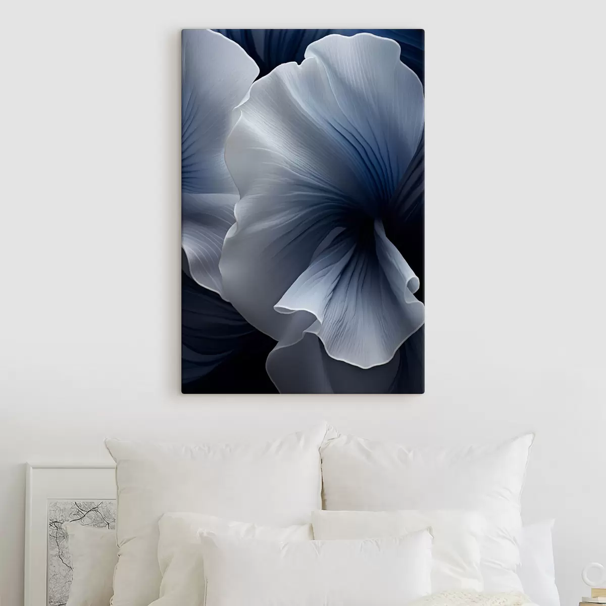 Tableau Pétales de fleurs abstraites bleues et blanches sur fond sombre Nr s48731