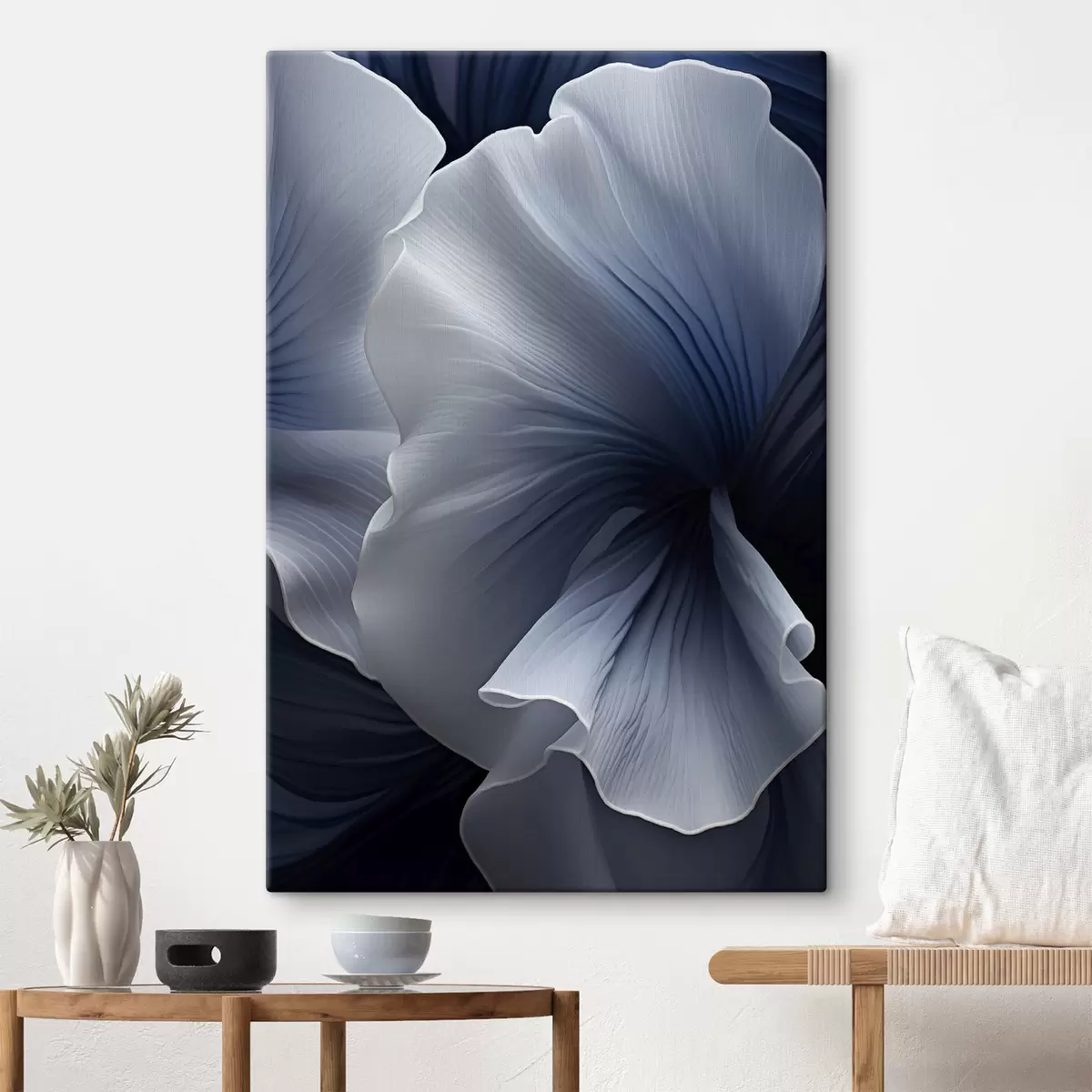 Tableau Pétales de fleurs abstraites bleues et blanches sur fond sombre s48731