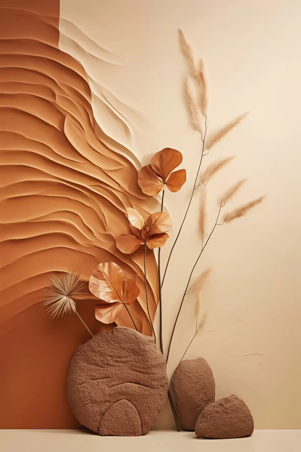 Tableau Une œuvre minimaliste composée de fleurs séchées et d'herbe de la pampa, sur un fond texturé Nr s48739
