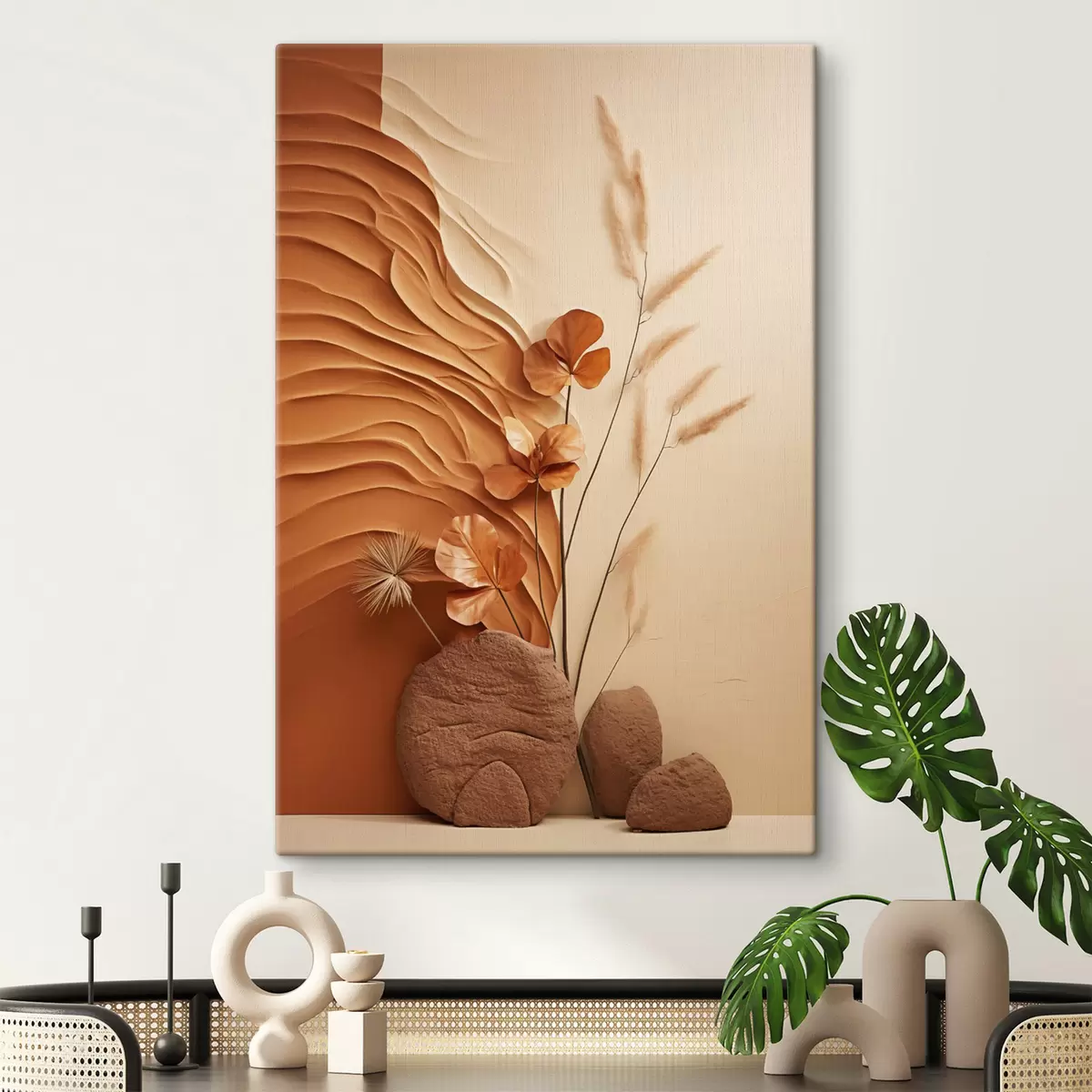 Tableau Une œuvre minimaliste composée de fleurs séchées et d'herbe de la pampa, sur un fond texturé s48739