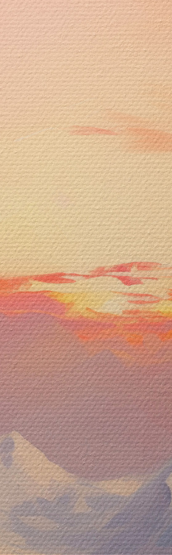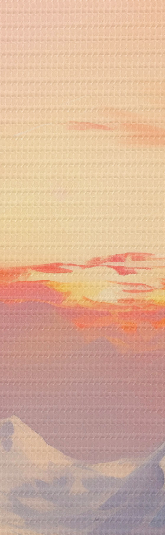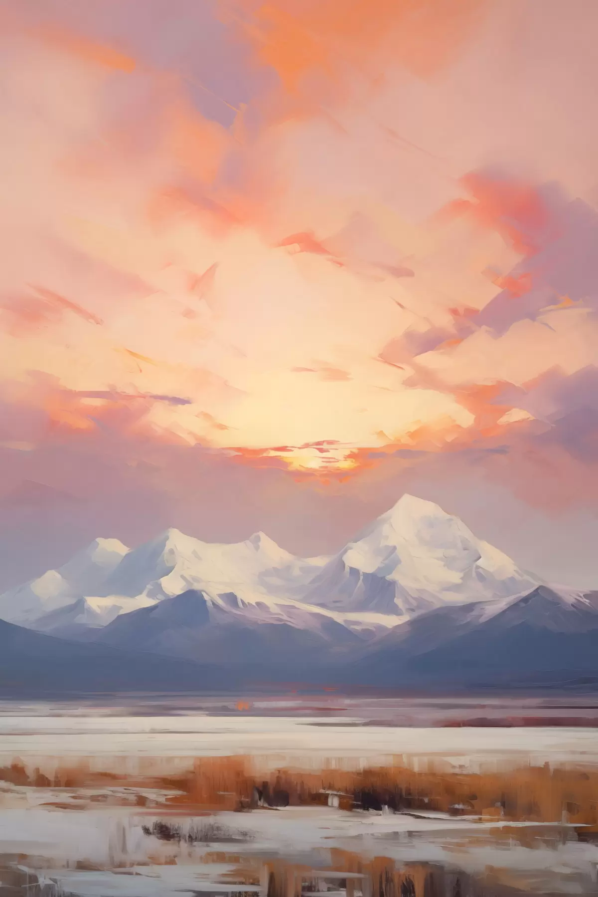 Tableau Des montagnes aux sommets enneigés sous un ciel aux teintes vives d'orange et de rose, parsemé de nuages s48742