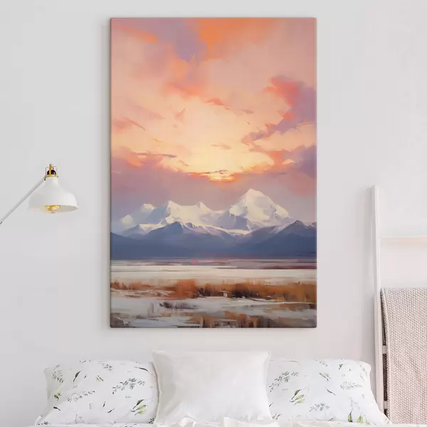 Tableau Des montagnes aux sommets enneigés sous un ciel aux teintes vives d'orange et de rose, parsemé de nuages Nr s48742