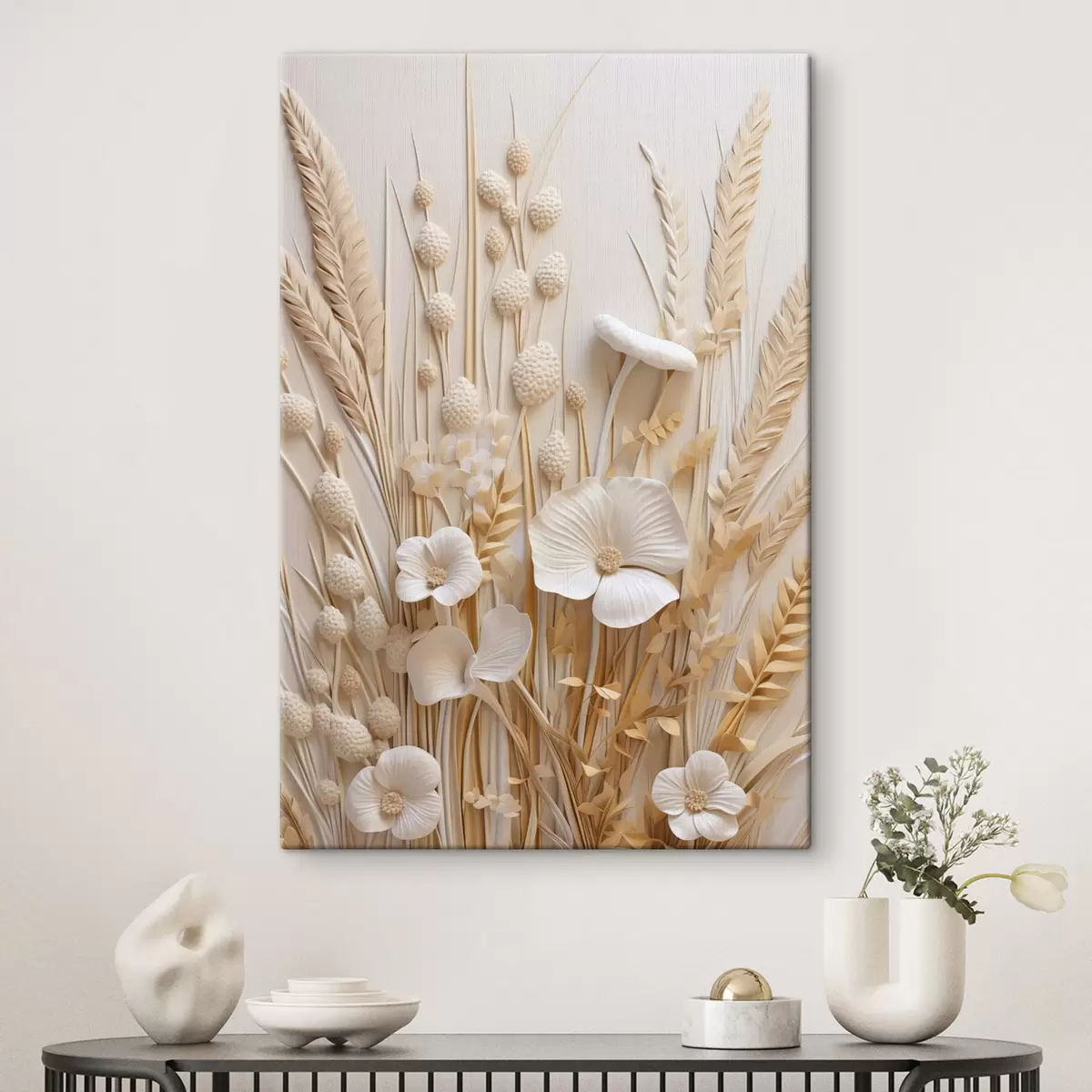 Tableau Un bouquet de coquelicots crème agrémenté de tiges de blé séchées s48748