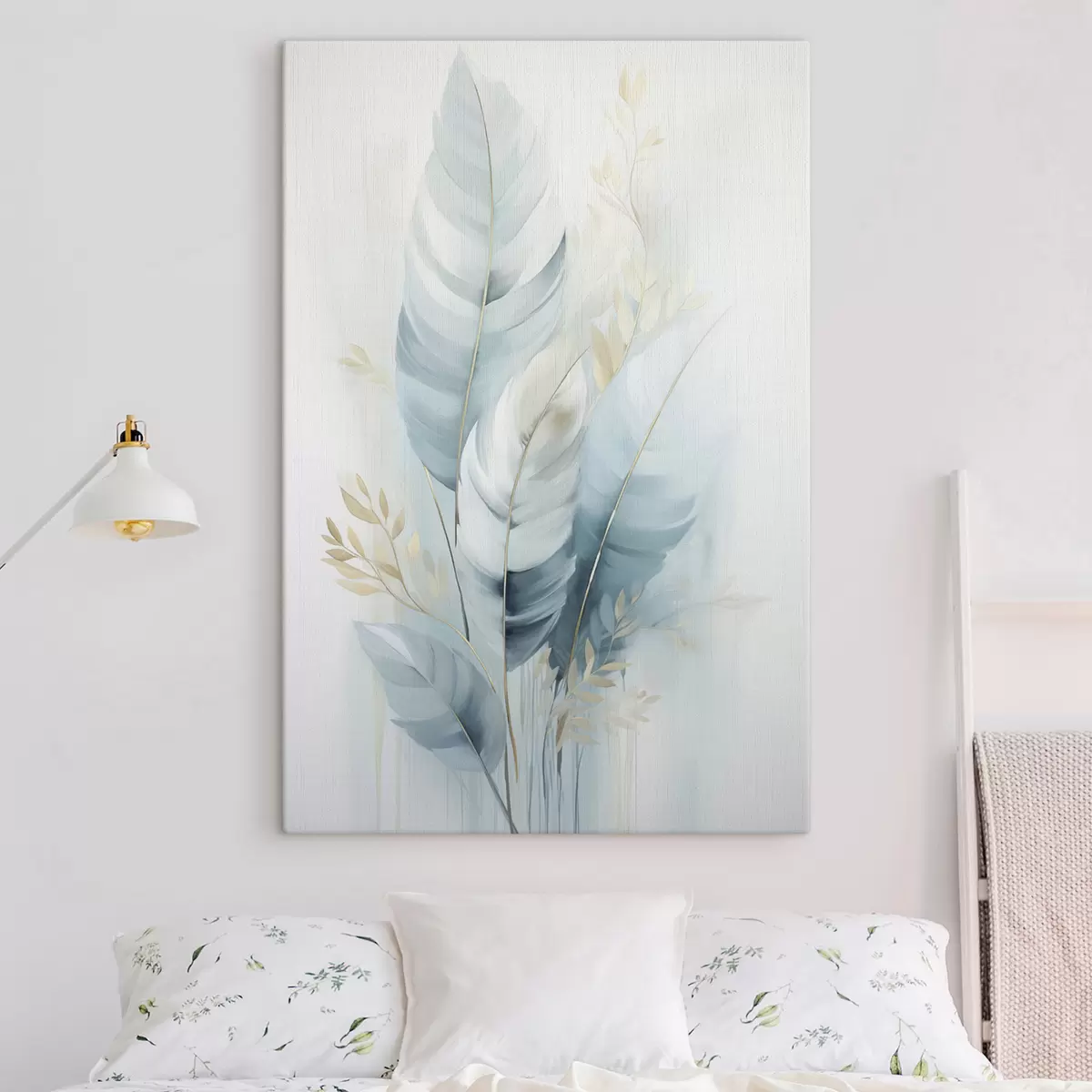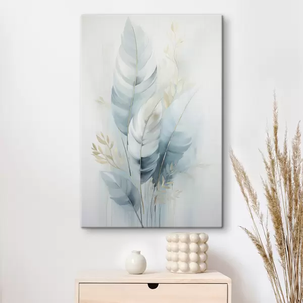 Tableau De grandes plumes douces dans des tons de bleu et de blanc, ornées de délicates feuilles beiges Nr s48749