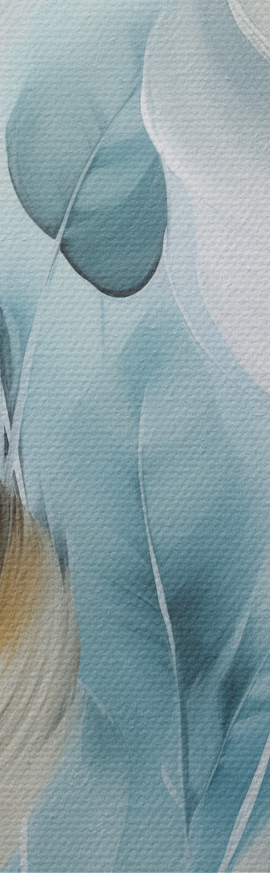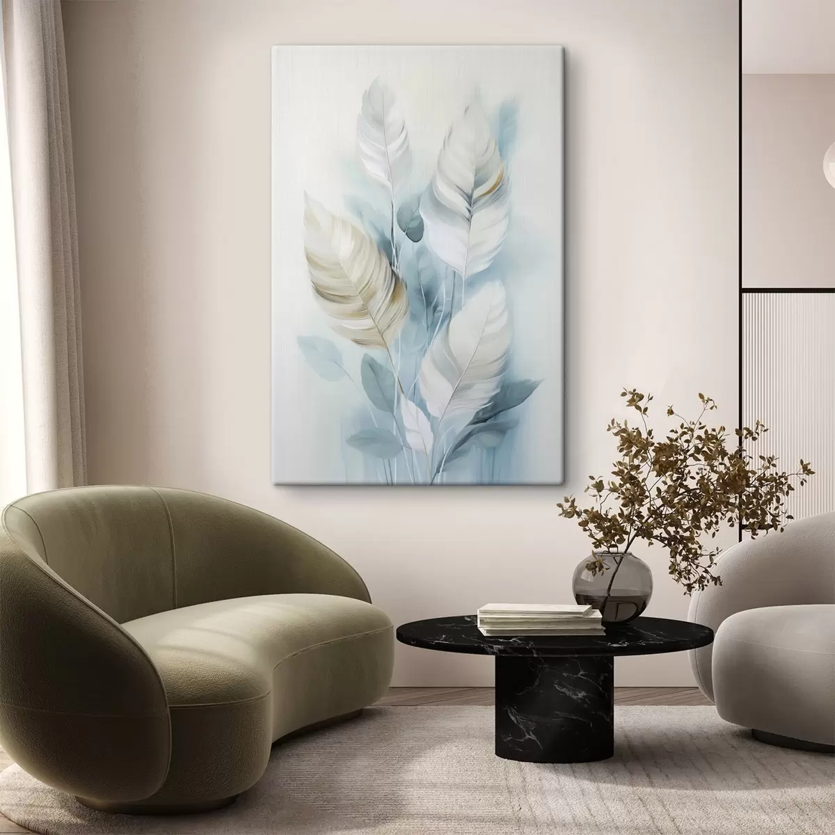 Tableau De grandes plumes douces dans des tons de bleu et de blanc, ornées de délicates feuilles beiges Nr s48750