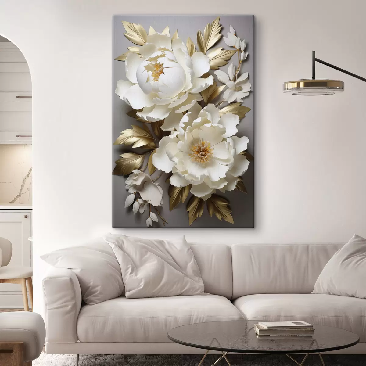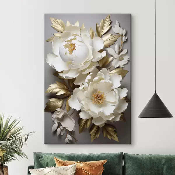 Tableau De grandes pivoines blanches aux feuilles jaunes sur fond gris Nr s48753