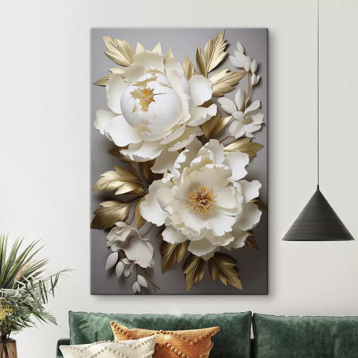 Tableau De grandes pivoines blanches aux feuilles jaunes sur fond gris s48753