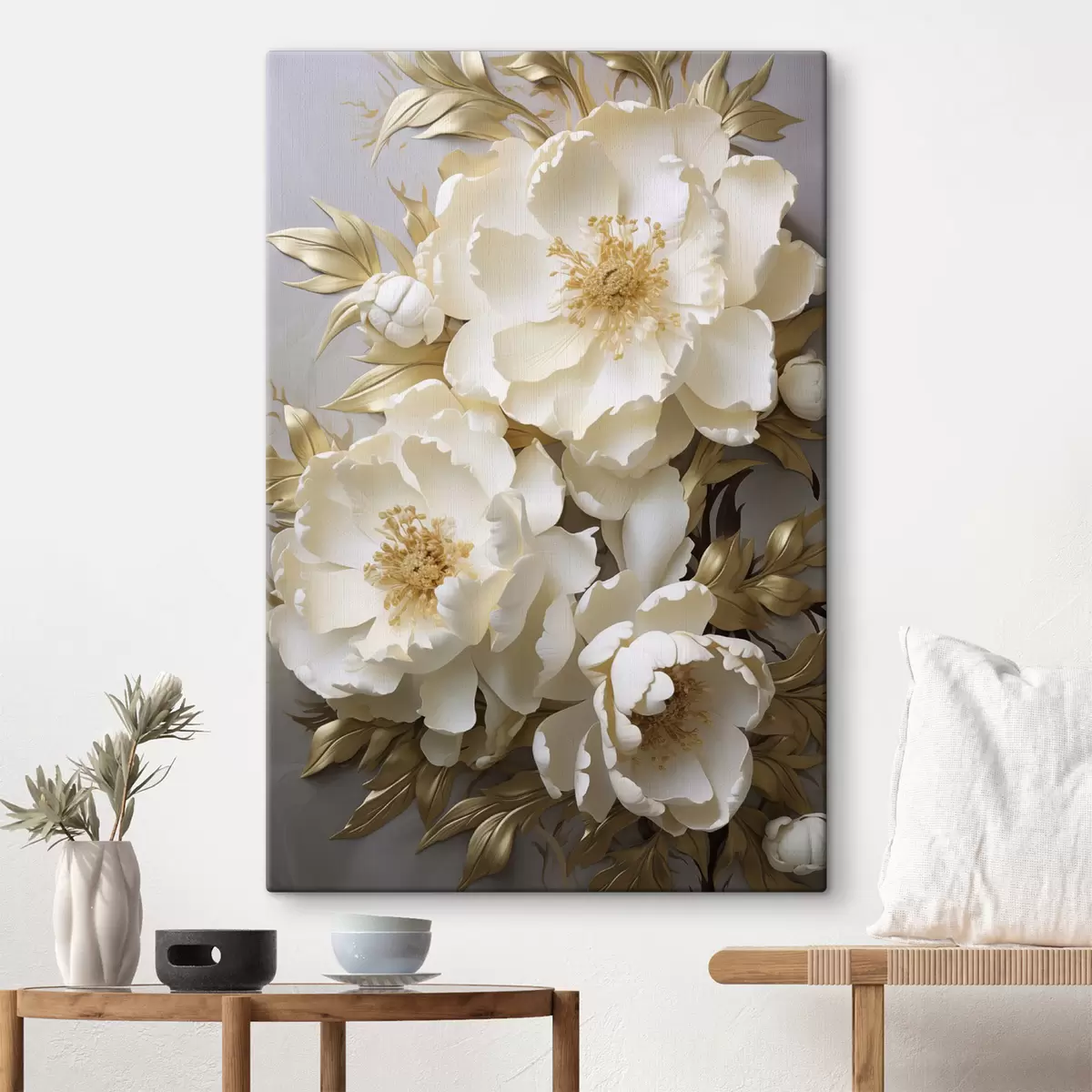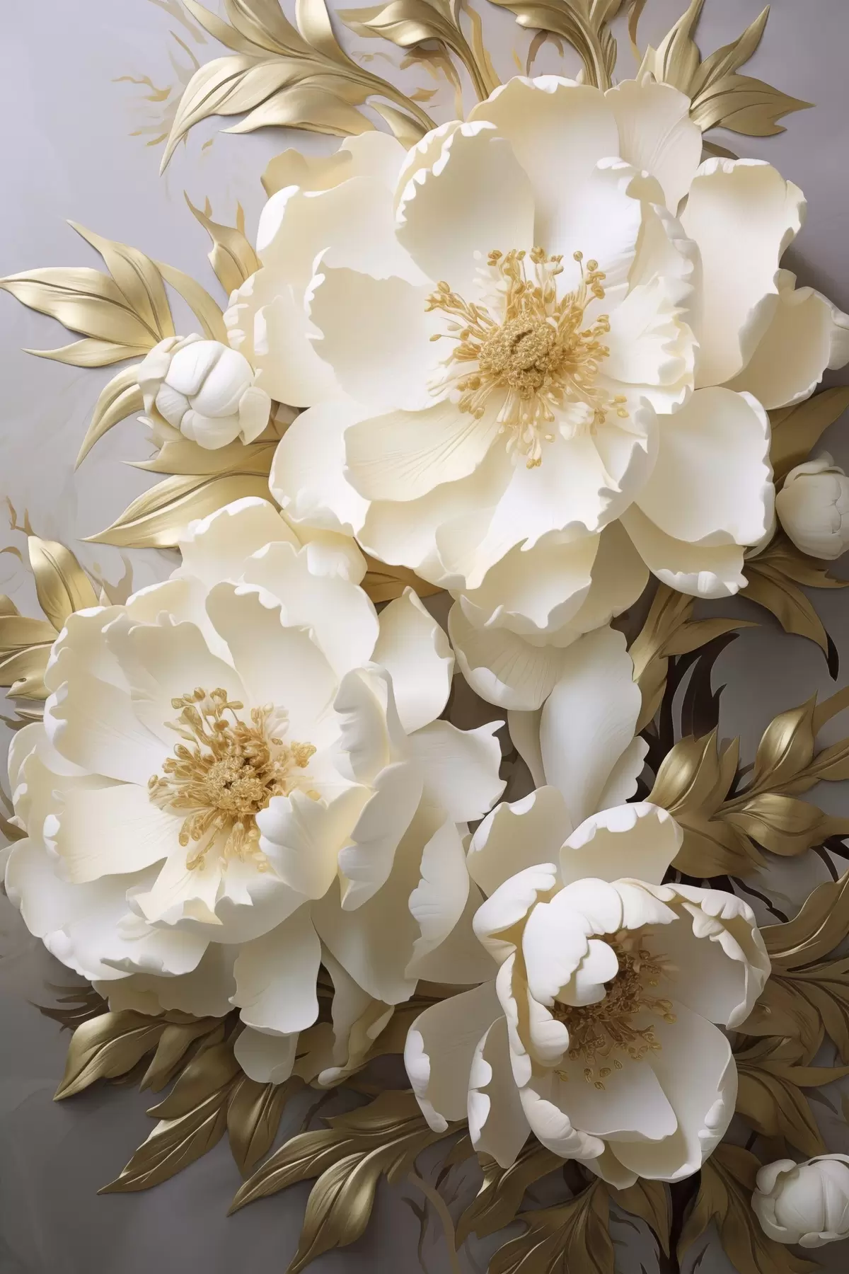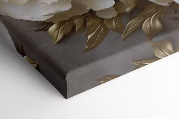 Tableau De grandes pivoines blanches aux feuilles jaunes sur fond gris Nr s48754