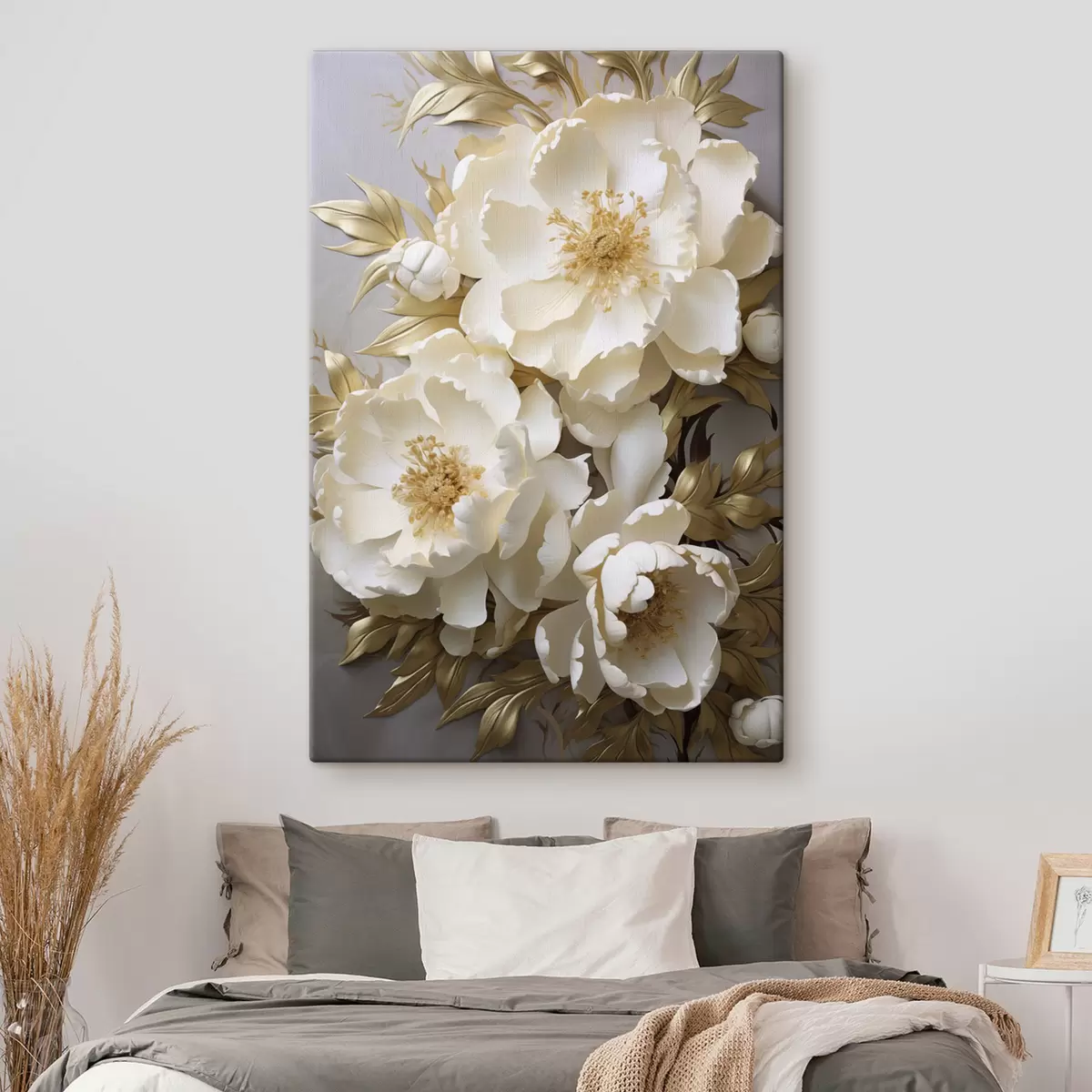 Tableau De grandes pivoines blanches aux feuilles jaunes sur fond gris s48754