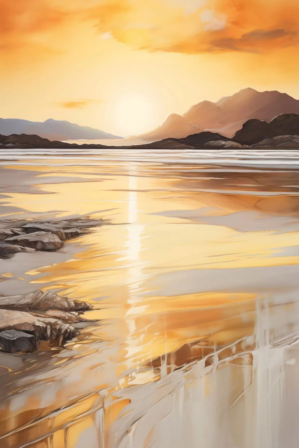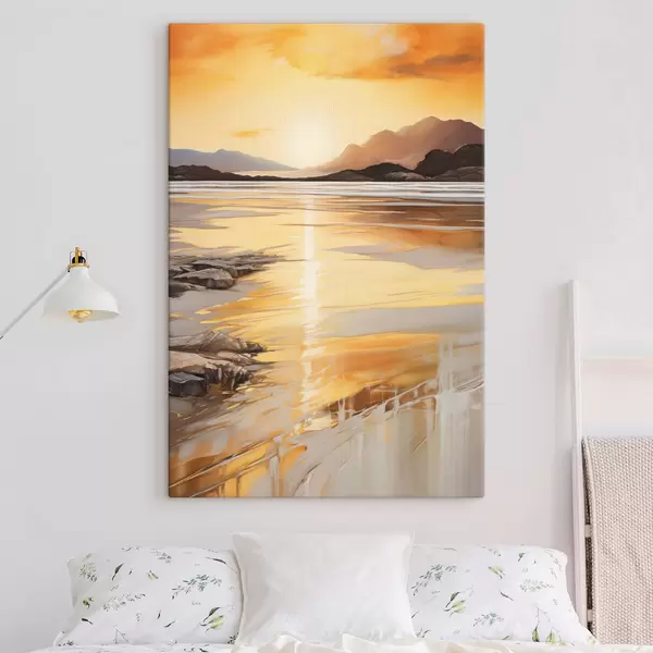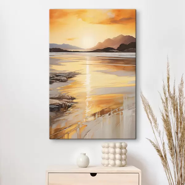 Tableau Un paysage avec une rivière et des montagnes sous un ciel orange aux teintes chaudes, au coucher du soleil Nr s48756