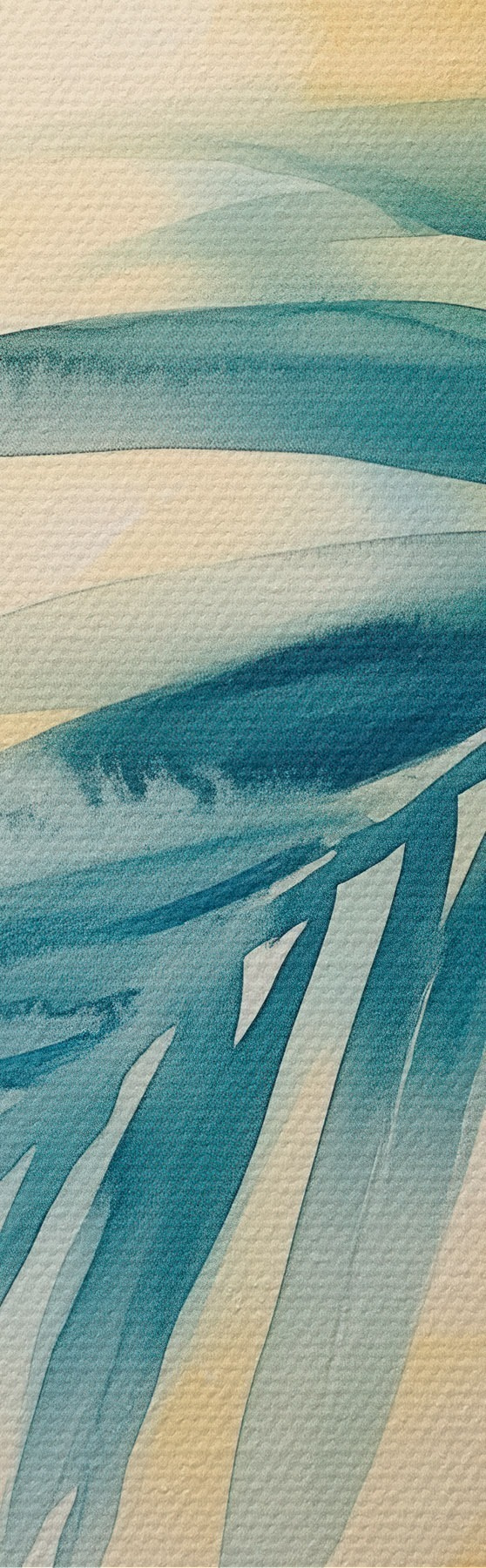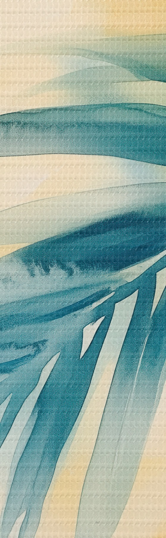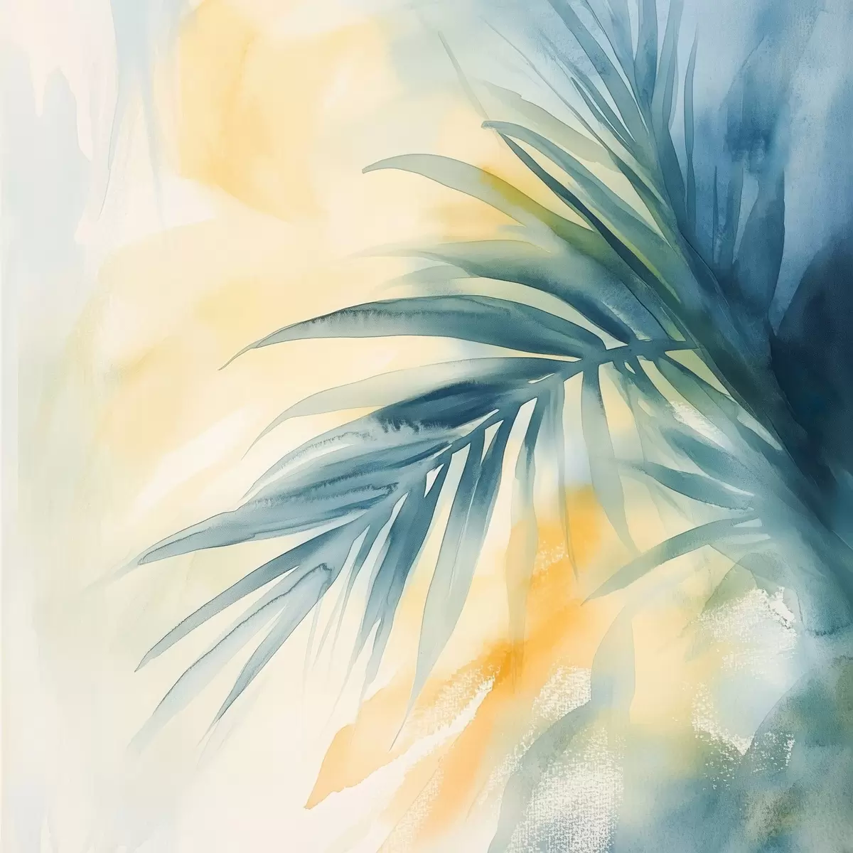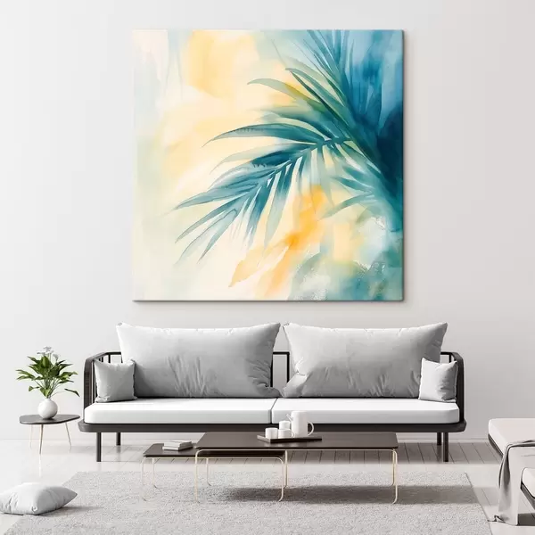 Tableau Des feuilles de palmier tropicales dans une palette bleu-turquoise, sur fond de taches d'aquarelle aux teintes chaudes Nr s48849
