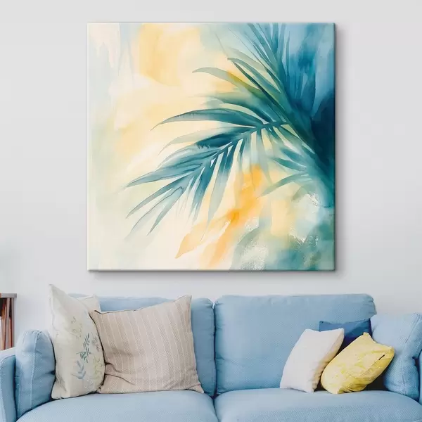 Tableau Des feuilles de palmier tropicales dans une palette bleu-turquoise, sur fond de taches d'aquarelle aux teintes chaudes s48849