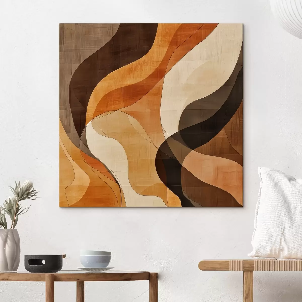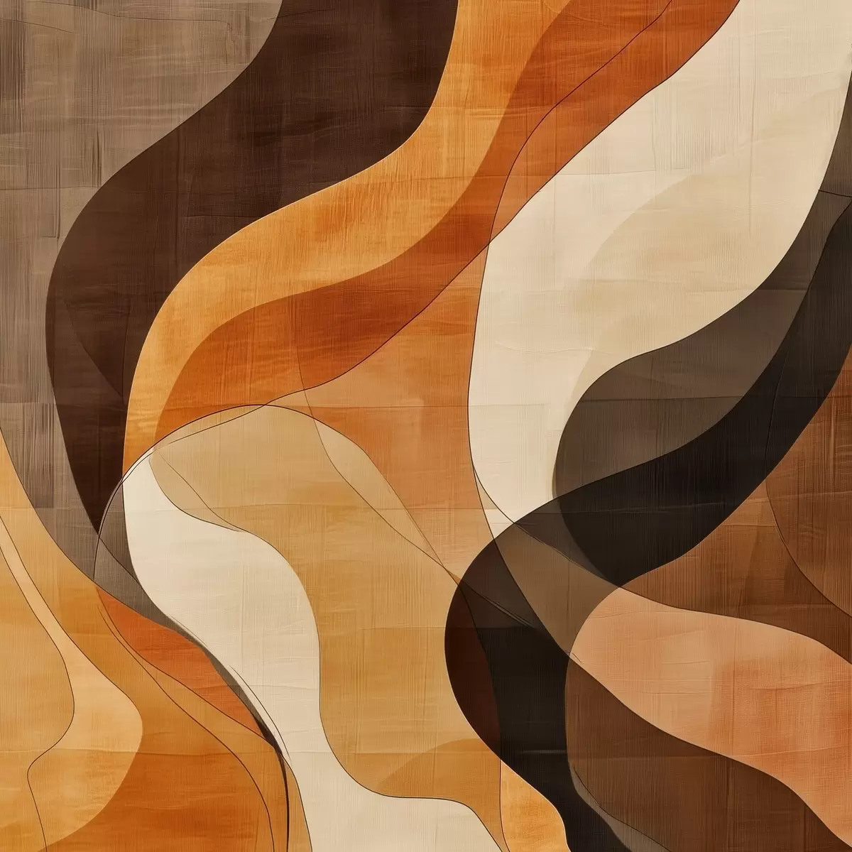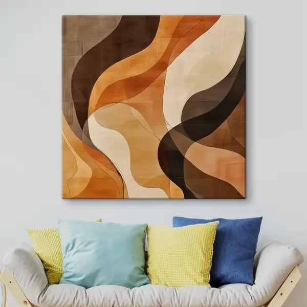 Tableau Composition abstraite aux lignes ondulées dynamiques, dans une palette de tons brun terre cuite s48851