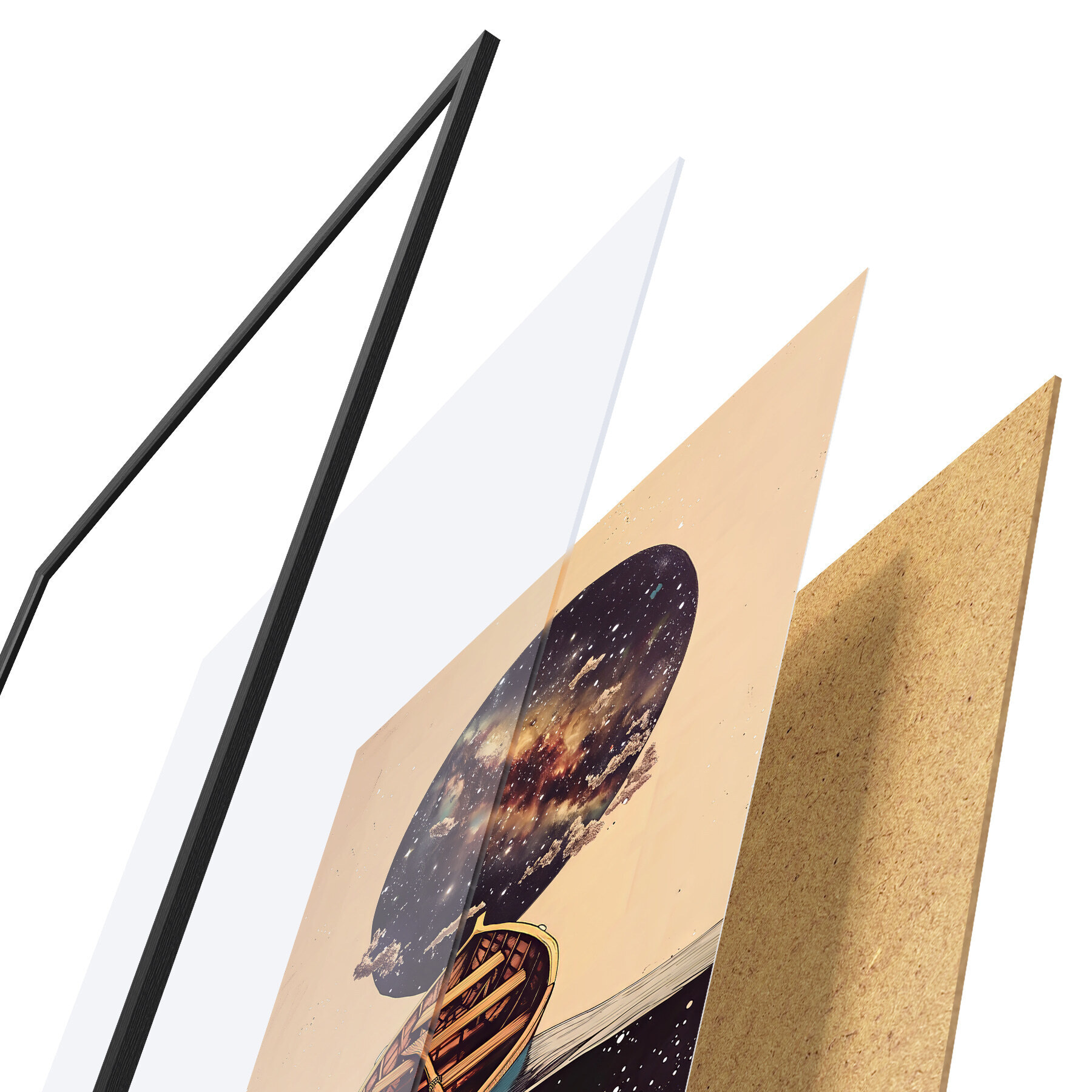 L’affiche encadrée est composée d’un cadre, d’un plexiglas, d’une image imprimée et d’un support en aggloméré. Elle est prête à être accrochée au mur grâce aux fixations situées à l’arrière.