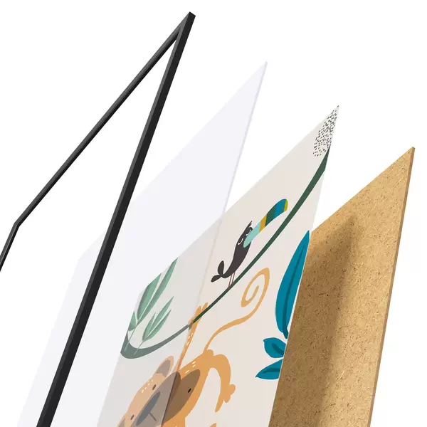 L’affiche encadrée est composée d’un cadre, d’un plexiglas, d’une image imprimée et d’un support en aggloméré. Elle est prête à être accrochée au mur grâce aux fixations situées à l’arrière.