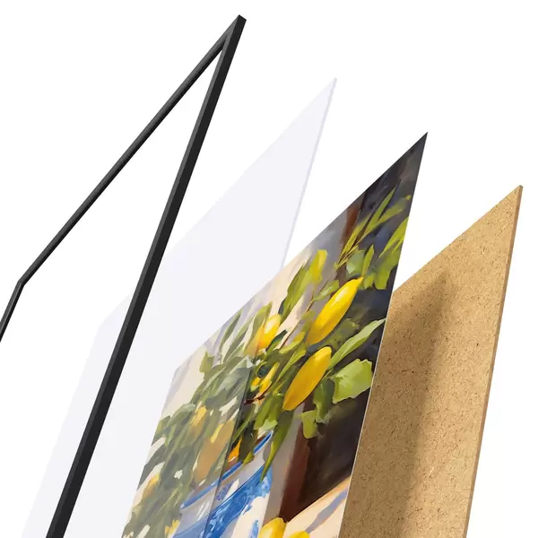 L’affiche encadrée est composée d’un cadre, d’un plexiglas, d’une image imprimée et d’un support en aggloméré. Elle est prête à être accrochée au mur grâce aux fixations situées à l’arrière.
