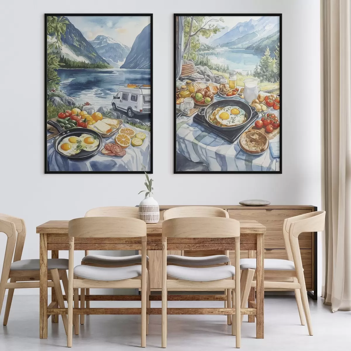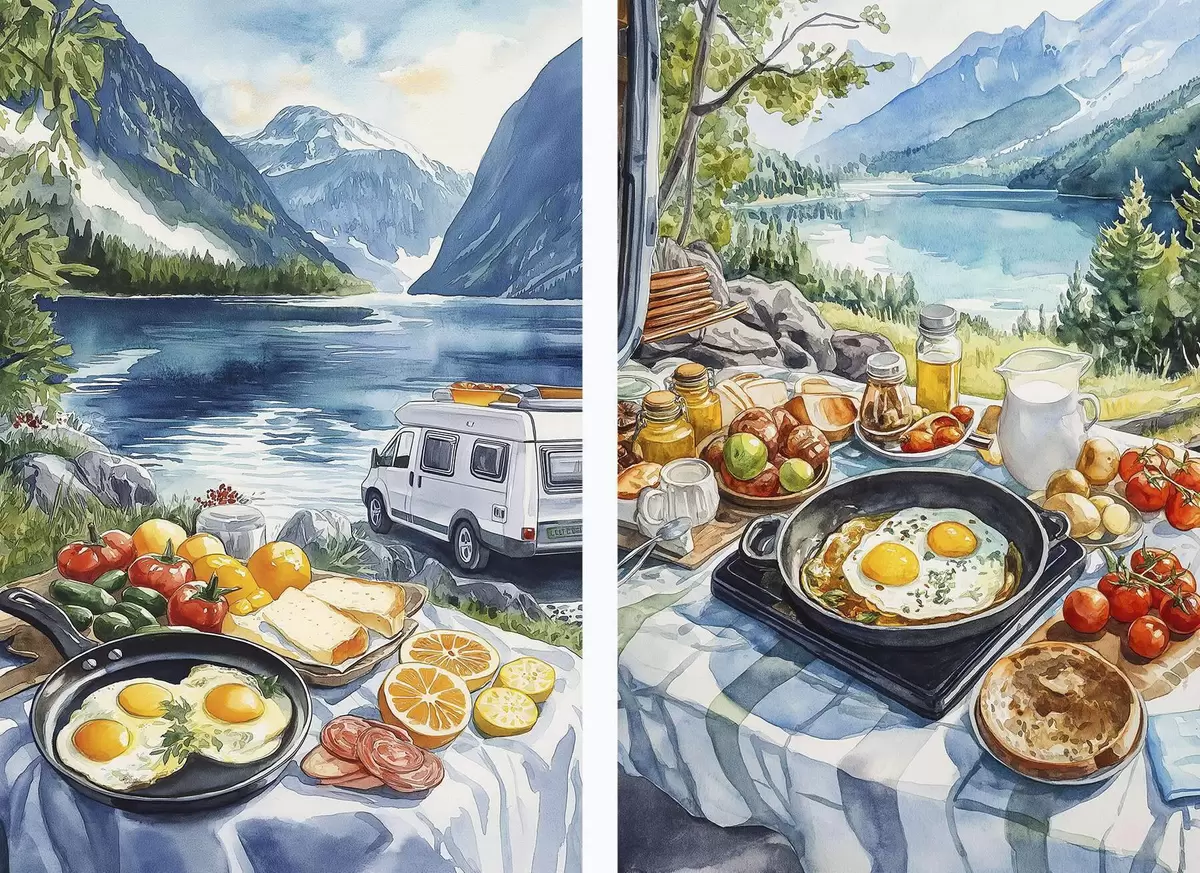 Poster Petit déjeuner dans la nature, voyage, vie en plein air, style aquarelle, Norvège d00404