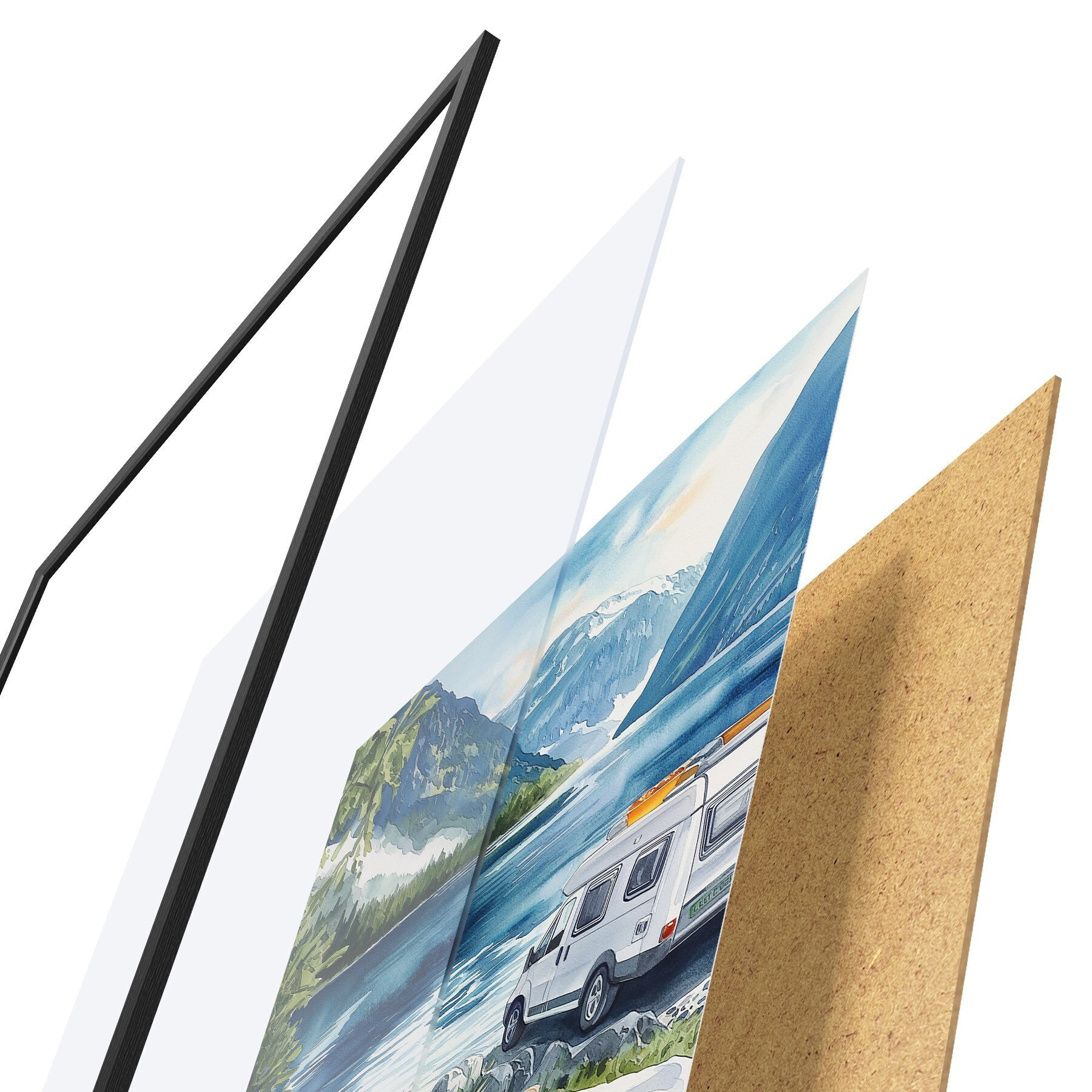 L’affiche encadrée est composée d’un cadre, d’un plexiglas, d’une image imprimée et d’un support en aggloméré. Elle est prête à être accrochée au mur grâce aux fixations situées à l’arrière.