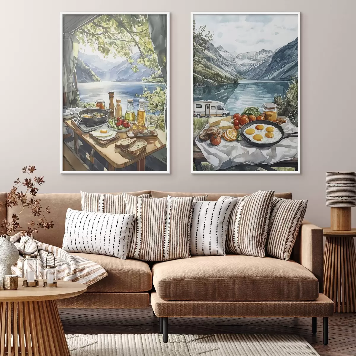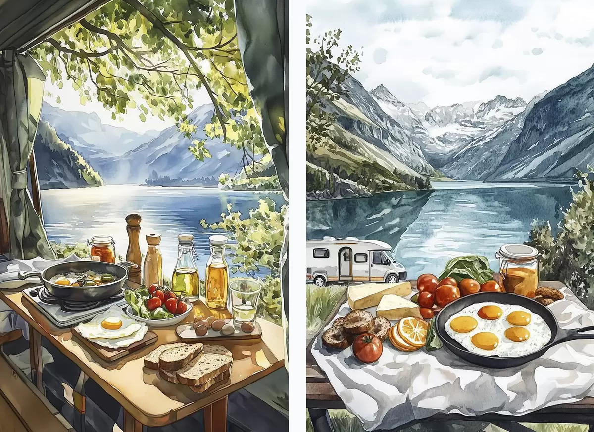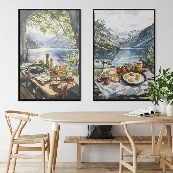 Poster Camping, petit déjeuner esthétique près du lac, style aquarelle Nr d00405