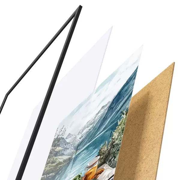 L’affiche encadrée est composée d’un cadre, d’un plexiglas, d’une image imprimée et d’un support en aggloméré. Elle est prête à être accrochée au mur grâce aux fixations situées à l’arrière.