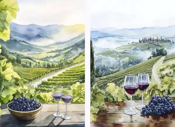 Poster Beaux paysages de Toscane, vignobles, verres à vin, style aquarelle, Italie Nr d00408