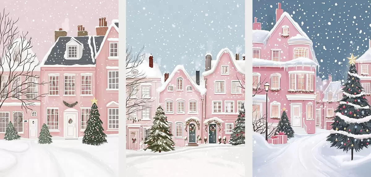 Poster Belle ville d'hiver avec des maisons roses, des pins et des flocons de neige d00410