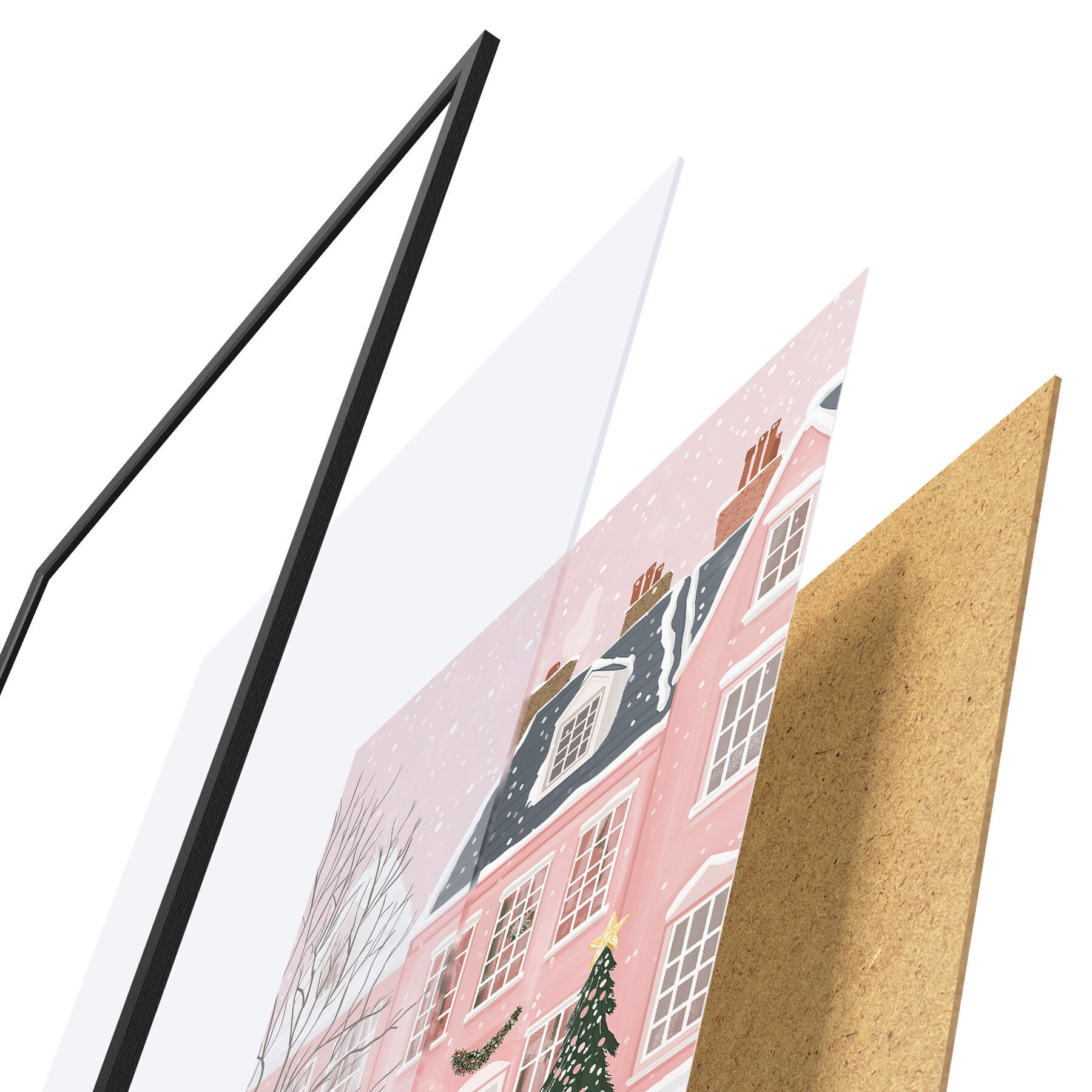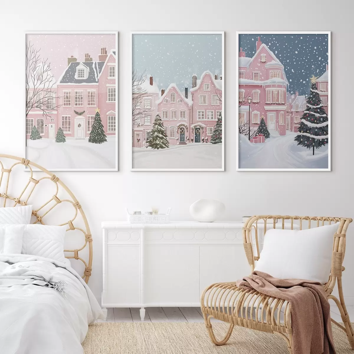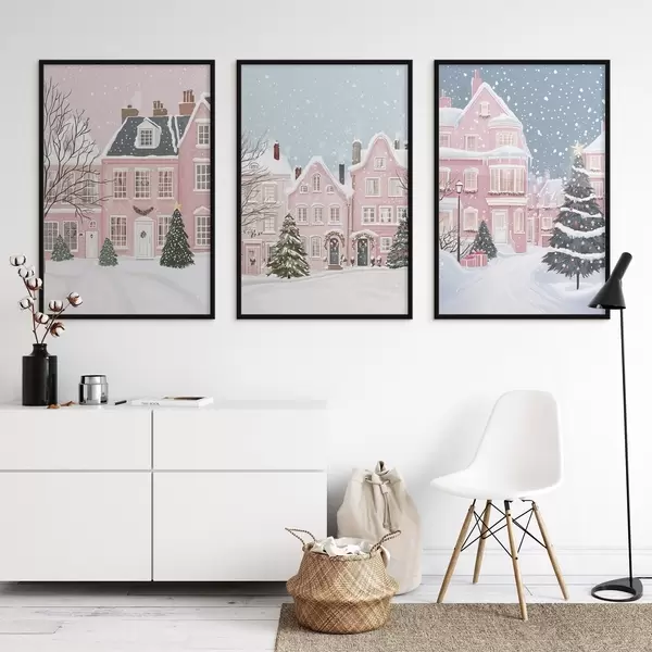 Poster Belle ville d'hiver avec des maisons roses, des pins et des flocons de neige Nr d00410