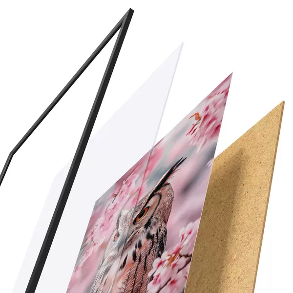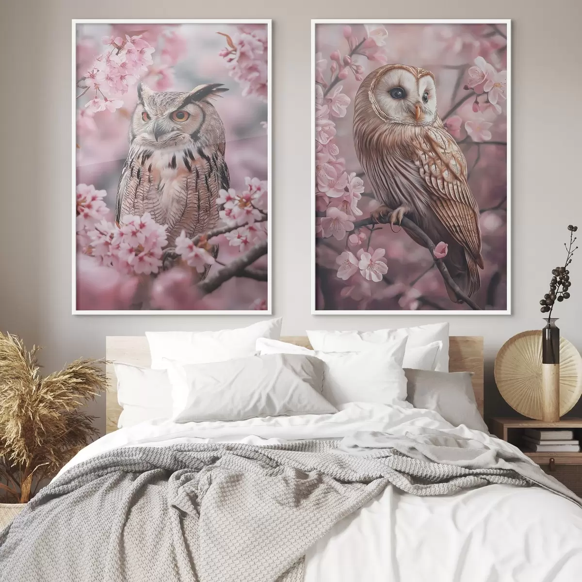 Poster Hiboux sur le cerisier, fleurs roses, réalisme, nature Nr d00411