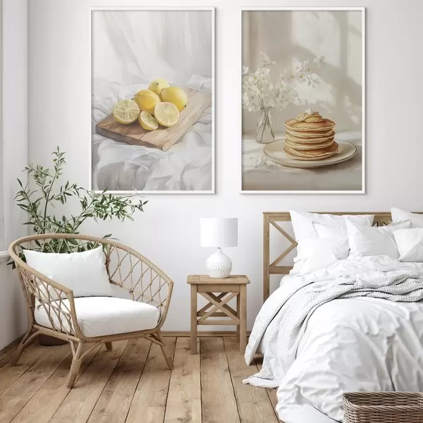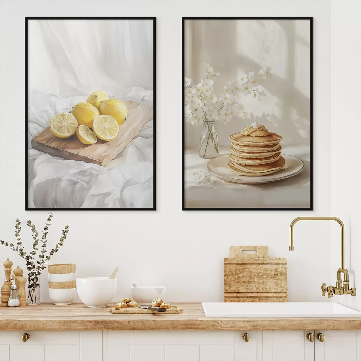 Poster Crêpes au beurre de cacahuètes, citrons sur la planche en bois, style aquarelle Nr d00416