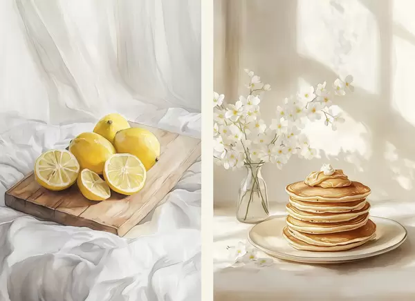 Poster Crêpes au beurre de cacahuètes, citrons sur la planche en bois, style aquarelle d00416