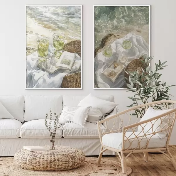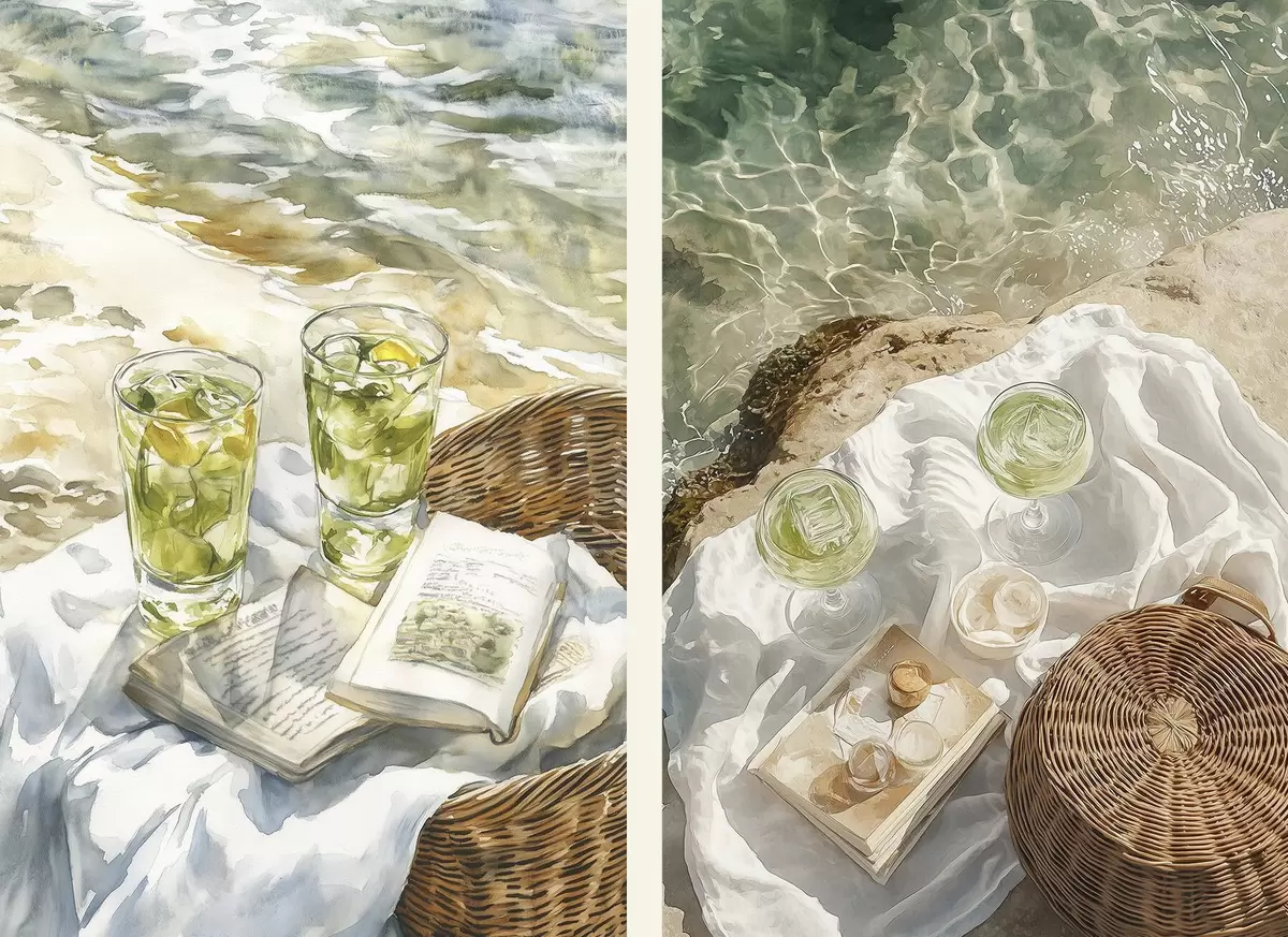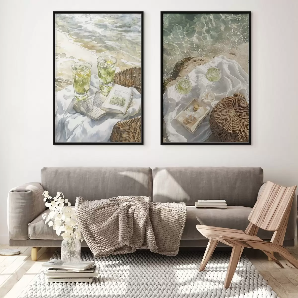 Poster Cocktails sur la plage, dessin à l'aquarelle, océan, pique-nique d'été d00417