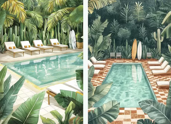Poster Piscine d'été, vintage, forêt tropicale, verdure, palmiers, style aquarelle d00422