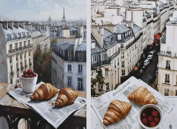 Poster Vue de la ville sur un balcon à Paris, tour Eiffel, fraises, café, journal Nr d00445
