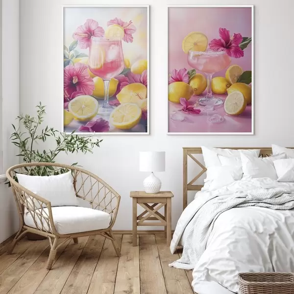 Poster Cocktails avec des fleurs d'hibiscus et des citrons, été, juteux, style aquarelle Nr d00446
