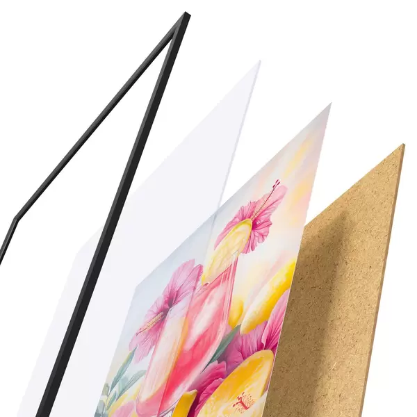L’affiche encadrée est composée d’un cadre, d’un plexiglas, d’une image imprimée et d’un support en aggloméré. Elle est prête à être accrochée au mur grâce aux fixations situées à l’arrière.