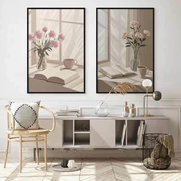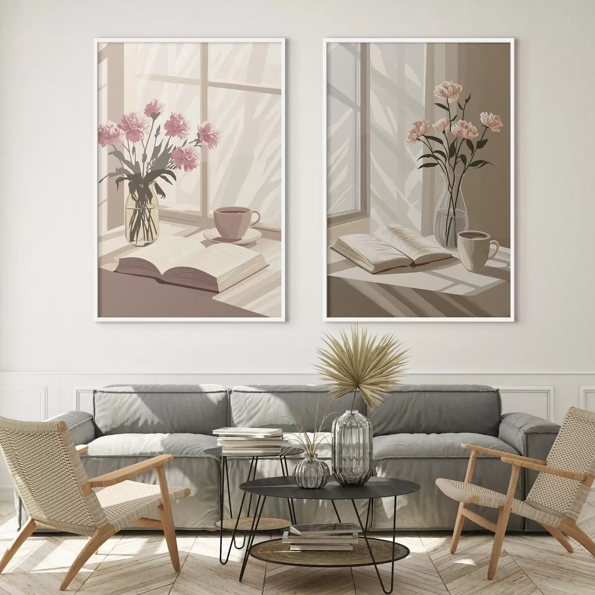 Poster Abstraction, esthétique matinale, tasse de café, livre, fleurs Nr d00448
