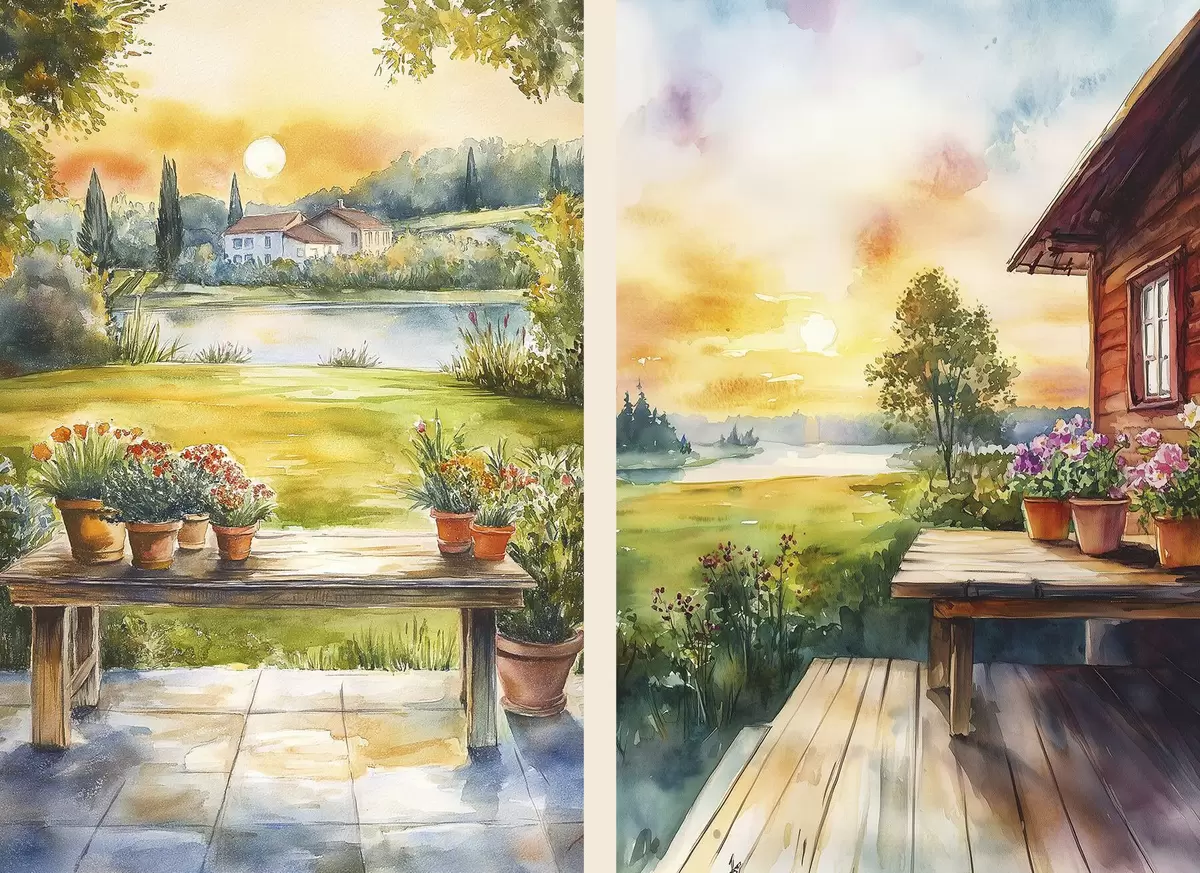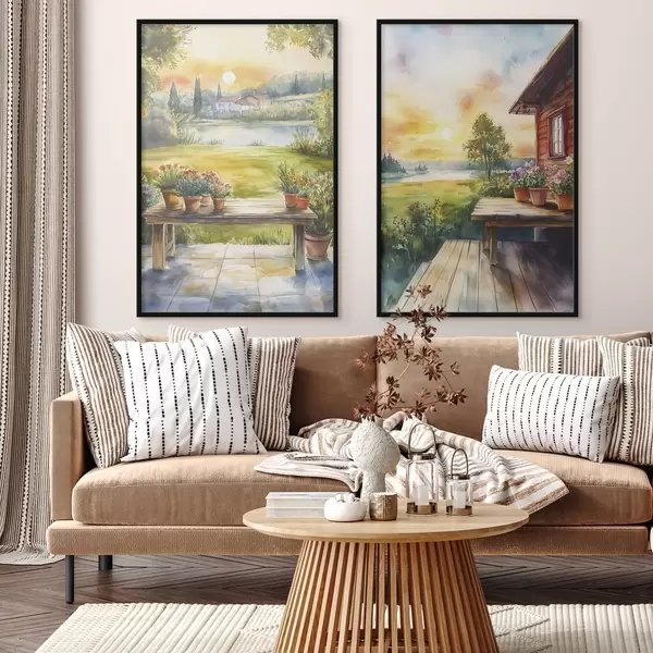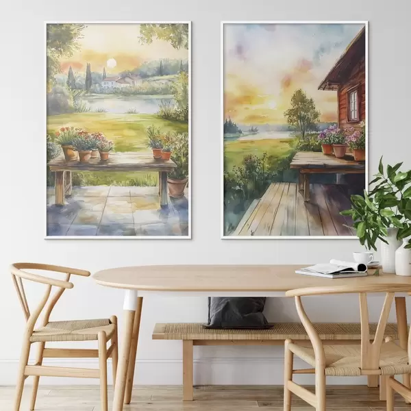 Poster Village d'été, coucher de soleil, rustique, fleurs, lac, style aquarelle Nr d00449