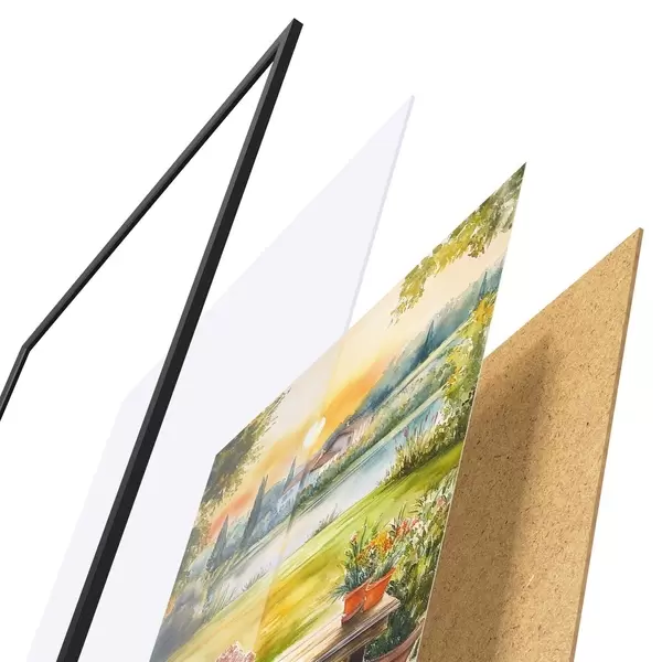 L’affiche encadrée est composée d’un cadre, d’un plexiglas, d’une image imprimée et d’un support en aggloméré. Elle est prête à être accrochée au mur grâce aux fixations situées à l’arrière.