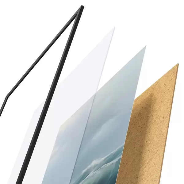 L’affiche encadrée est composée d’un cadre, d’un plexiglas, d’une image imprimée et d’un support en aggloméré. Elle est prête à être accrochée au mur grâce aux fixations situées à l’arrière.