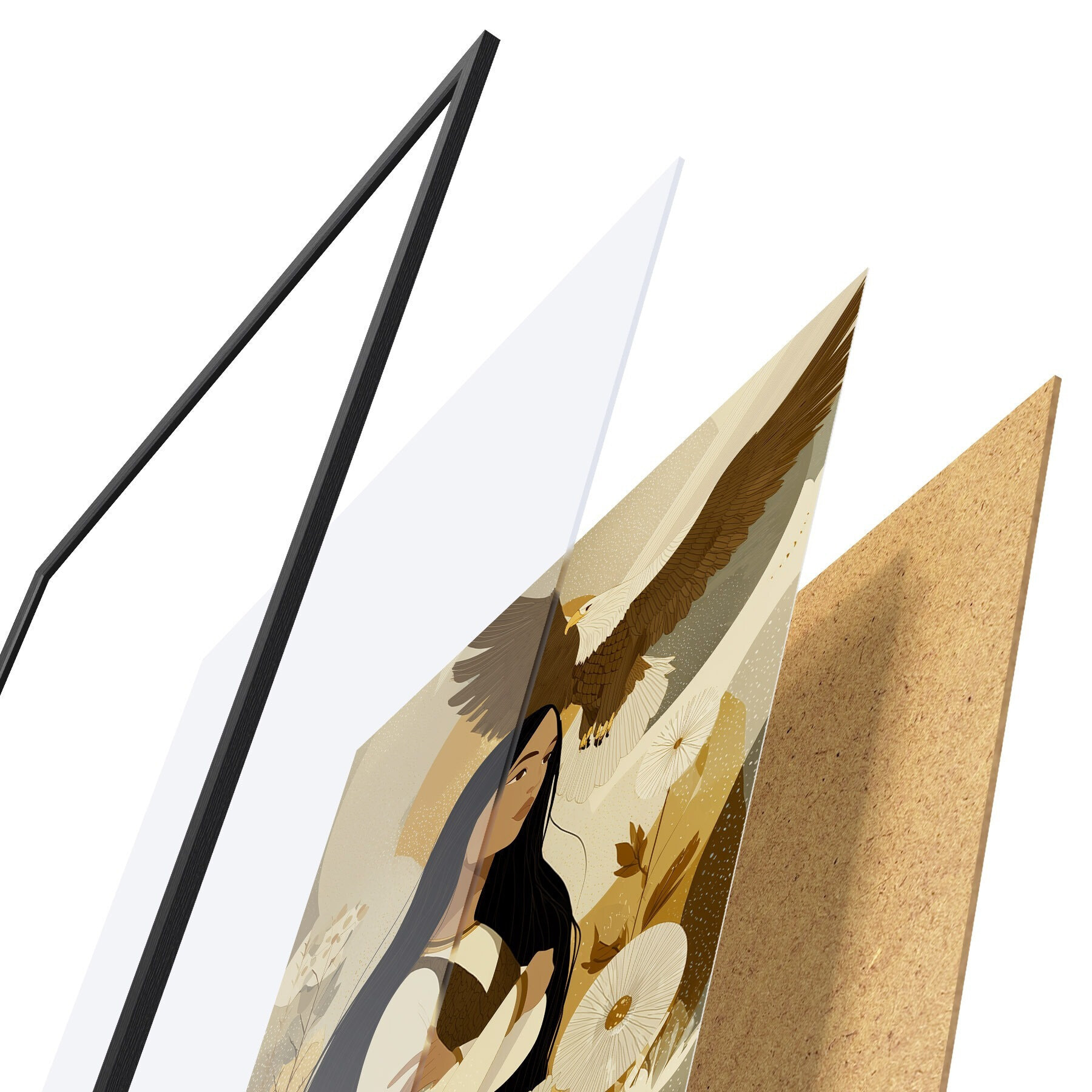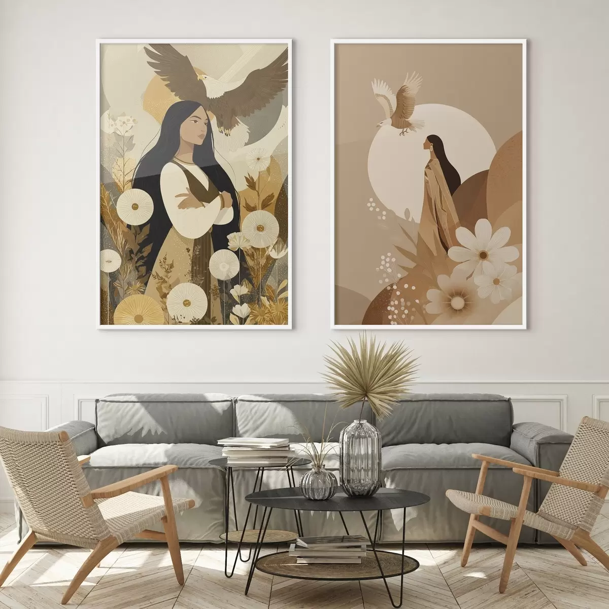 Poster Femmes avec aigles volants, style tribal, couleurs beiges d00477