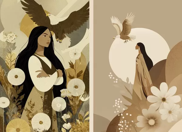 Poster Femmes avec aigles volants, style tribal, couleurs beiges d00477