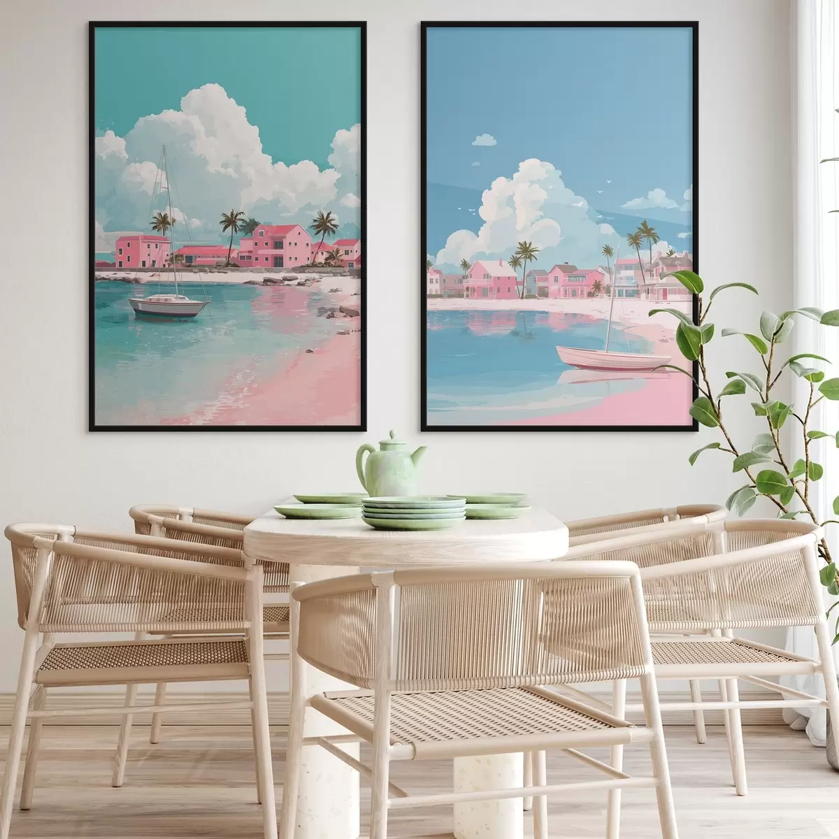 Poster Plage d'été rose avec soleil, voilier et maisons Nr d00479
