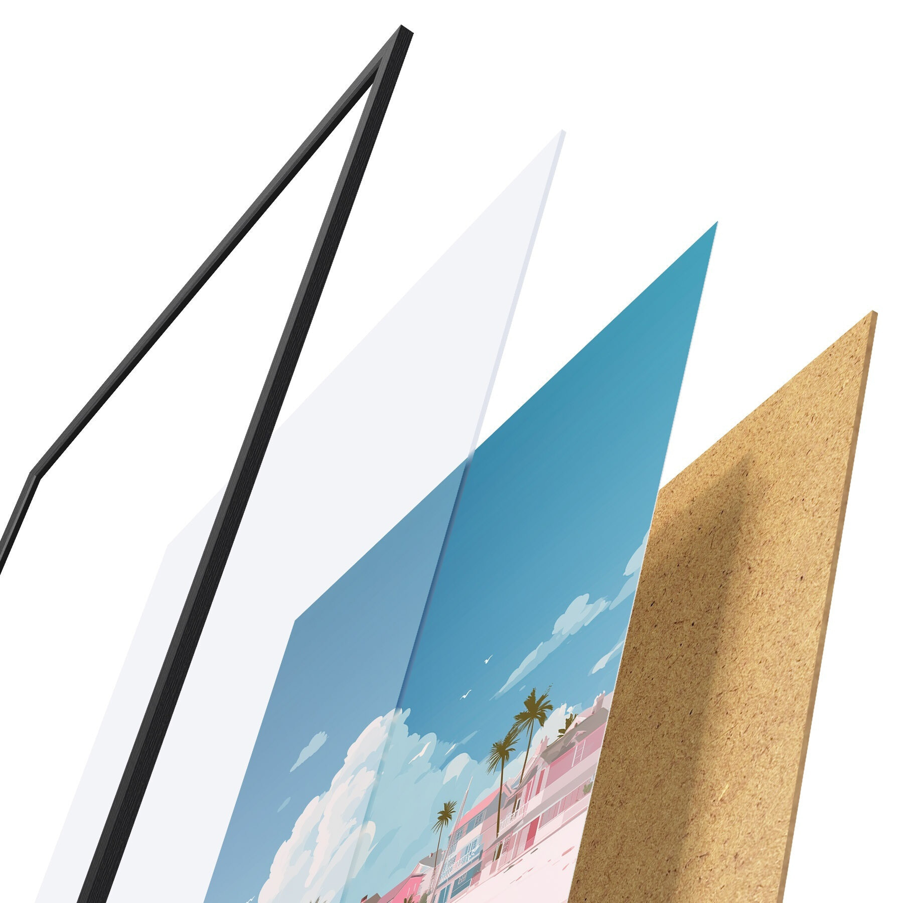 L’affiche encadrée est composée d’un cadre, d’un plexiglas, d’une image imprimée et d’un support en aggloméré. Elle est prête à être accrochée au mur grâce aux fixations situées à l’arrière.