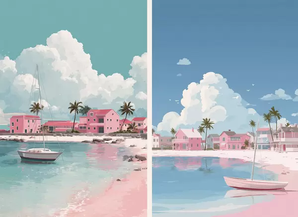 Poster Plage d'été rose avec soleil, voilier et maisons Nr d00479
