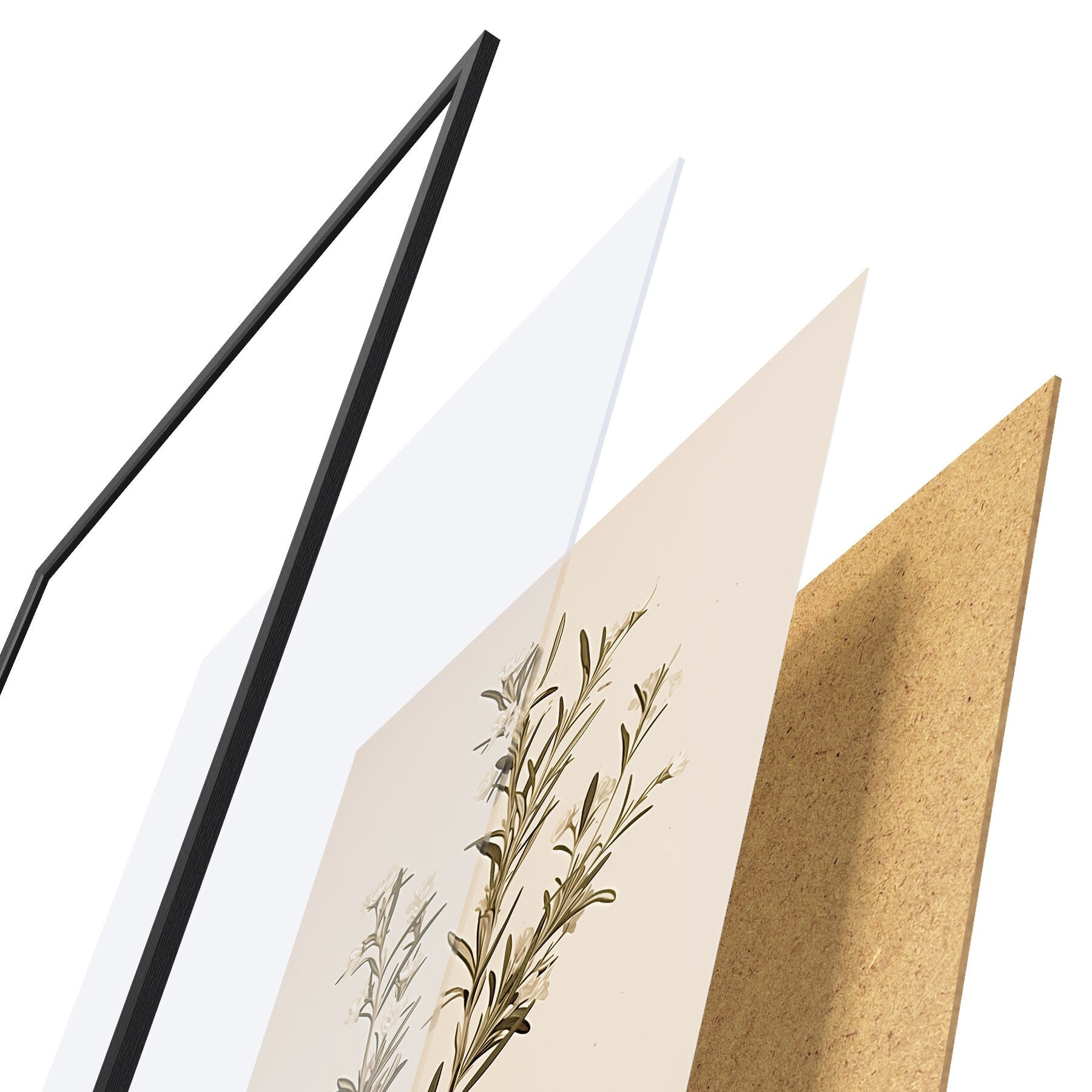L’affiche encadrée est composée d’un cadre, d’un plexiglas, d’une image imprimée et d’un support en aggloméré. Elle est prête à être accrochée au mur grâce aux fixations situées à l’arrière.