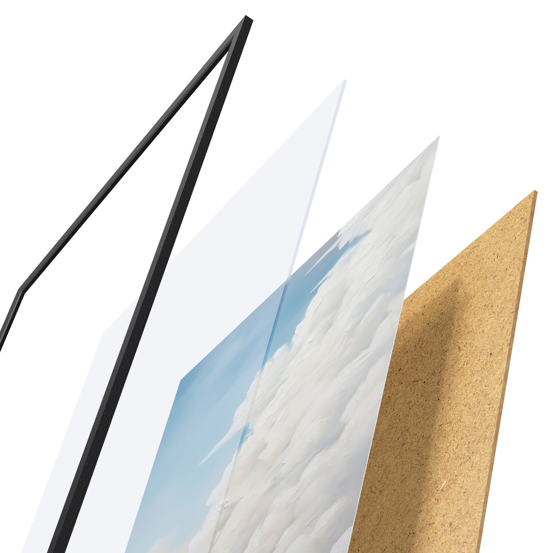L’affiche encadrée est composée d’un cadre, d’un plexiglas, d’une image imprimée et d’un support en aggloméré. Elle est prête à être accrochée au mur grâce aux fixations situées à l’arrière.