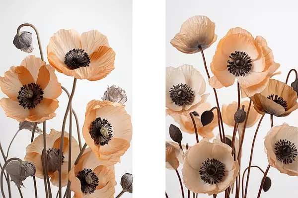 Poster Coquelicots orange, fleurs séchées sur fond clair, éclairage doux, pétales délicats, arrangement floral d00518